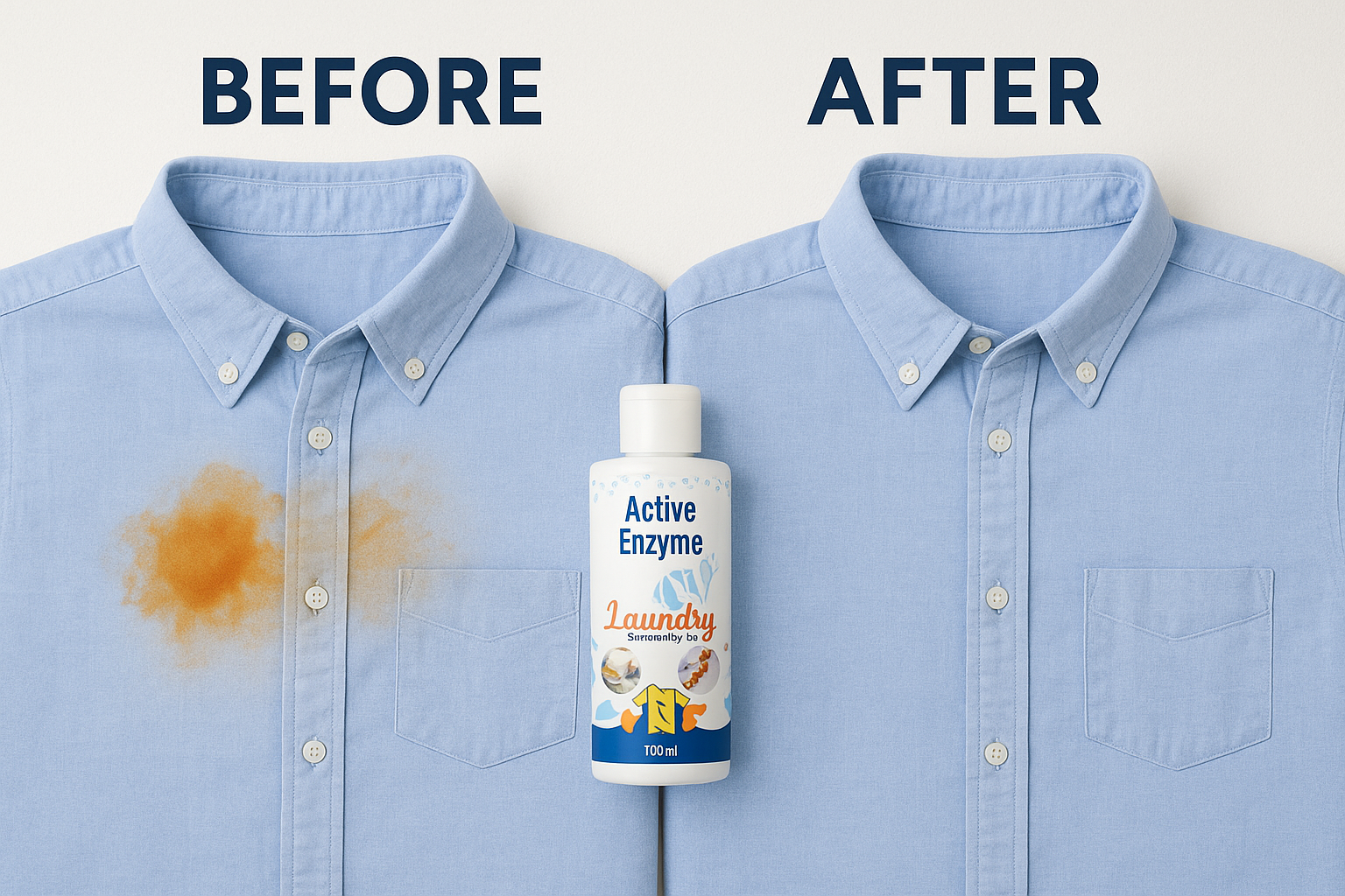 Active Enzyme Laundry Stain Remover is specially formulated to remove oil, grease, sweat, food, ink, makeup, turmeric, collar stains & more without damaging fabric.